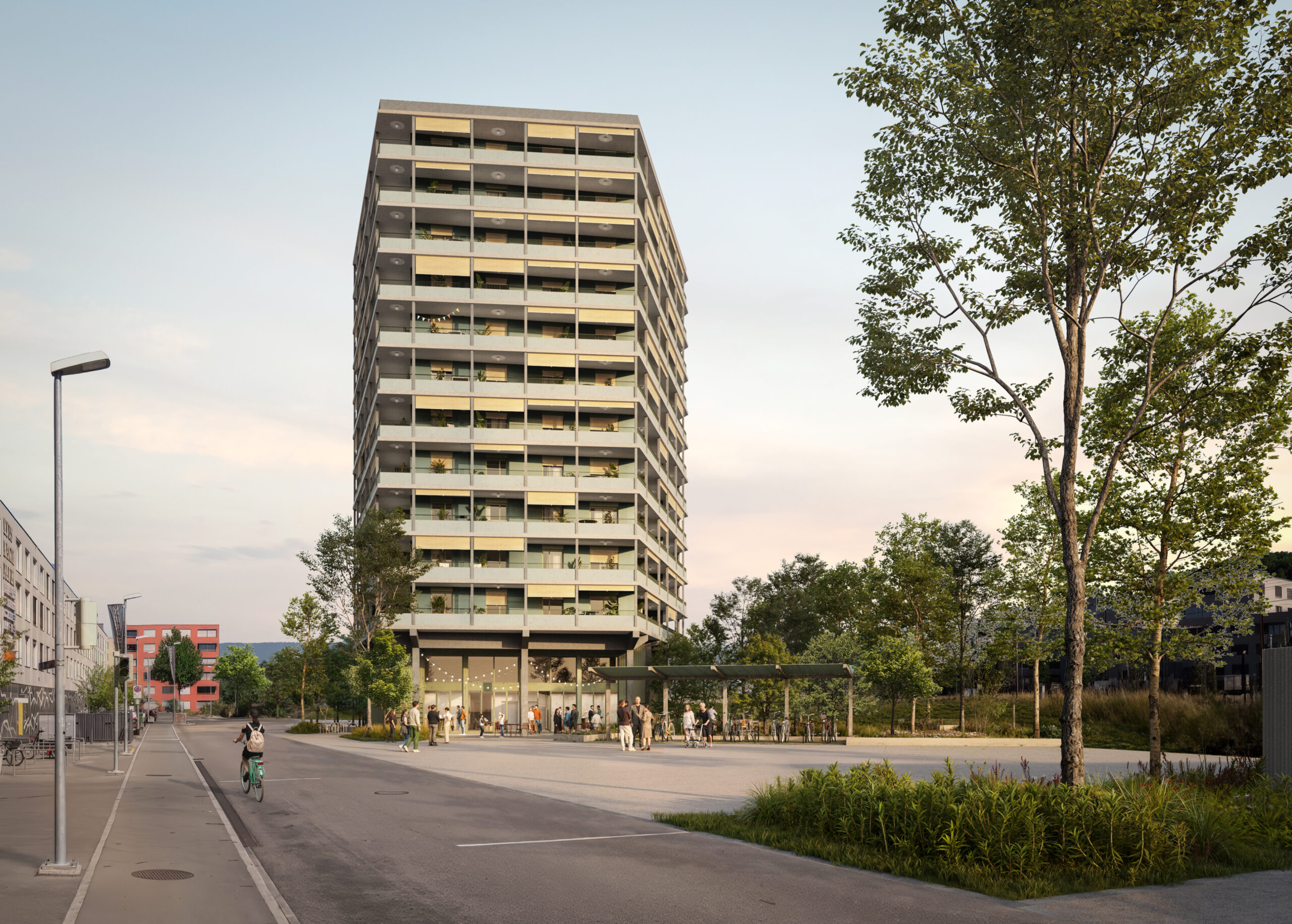 An der Bahnhofstrasse 32 entsteht bis 2029 ein neues Wohnhochhaus mit 13 Geschossen. Der Neubau bildet den städtebaulichen Abschluss des Quartiers und setzt mit seiner klaren, allseitig vermittelnden Architektur einen markanten Akzent im Zentrum von Lyss.